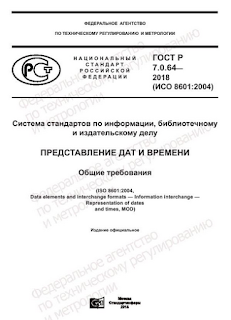 На сайте Федерального агентства по техническому регулированию и метрологии ( http://www.gost.ru/ ) в июньском 2018 года разделе ( http://protect.gost.ru/default.aspx?control=6&month=6&year=2018 ) выложен ряд документов, в том числе стандарт ГОСТ Р 7.0.64-2018 «Система стандартов по информации, библиотечному и издательскому делу. Представление дат и времени. Общие требования» объёмом 40 страниц, вступающий в силу 01.01.2019 года, см. http://protect.gost.ru/v.aspx?control=8&baseC=6&id=222978