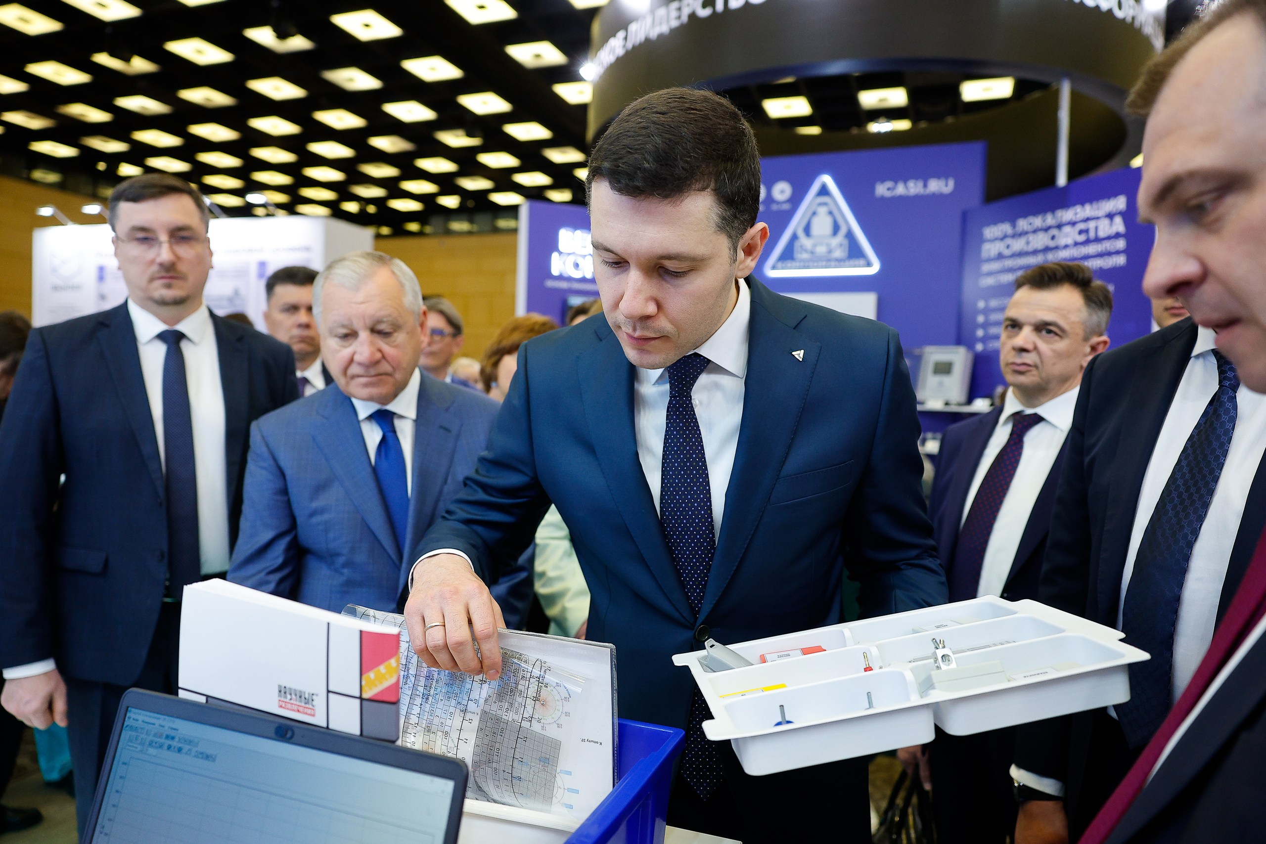 Руководитель Росстандарта Антон Шалаев представил первому вице-премьеру и главе Минпромторга России ключевые достижения ученых-метрологов и возможностей отечественных производителей средств измерений. На стенде Росстандарта специалисты подведомственного Всероссийского НИИ физико-технических и радиотехнических измерений продемонстрировали высокоточный относительный гравиметр «ПЕШЕХОД», который измеряет значения гравитационного поля с точностью до единиц микрогал, а также экспресс-метод обнаружения фальсификатов продукции масложировой промышленности. Кроме того, были показаны портативный анализатор спектра СК4М-14, позволяющий полностью отказаться от зарубежных средств измерений и комплект средств поверки зарядных станций.